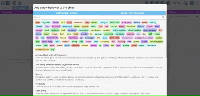 In this chapter, we will learn how to use Behaviours in our game. You can read the Behaviors page to learn more about them. Behaviors add extra capabilities to objects. All objects can have one or more behaviors attached to it.